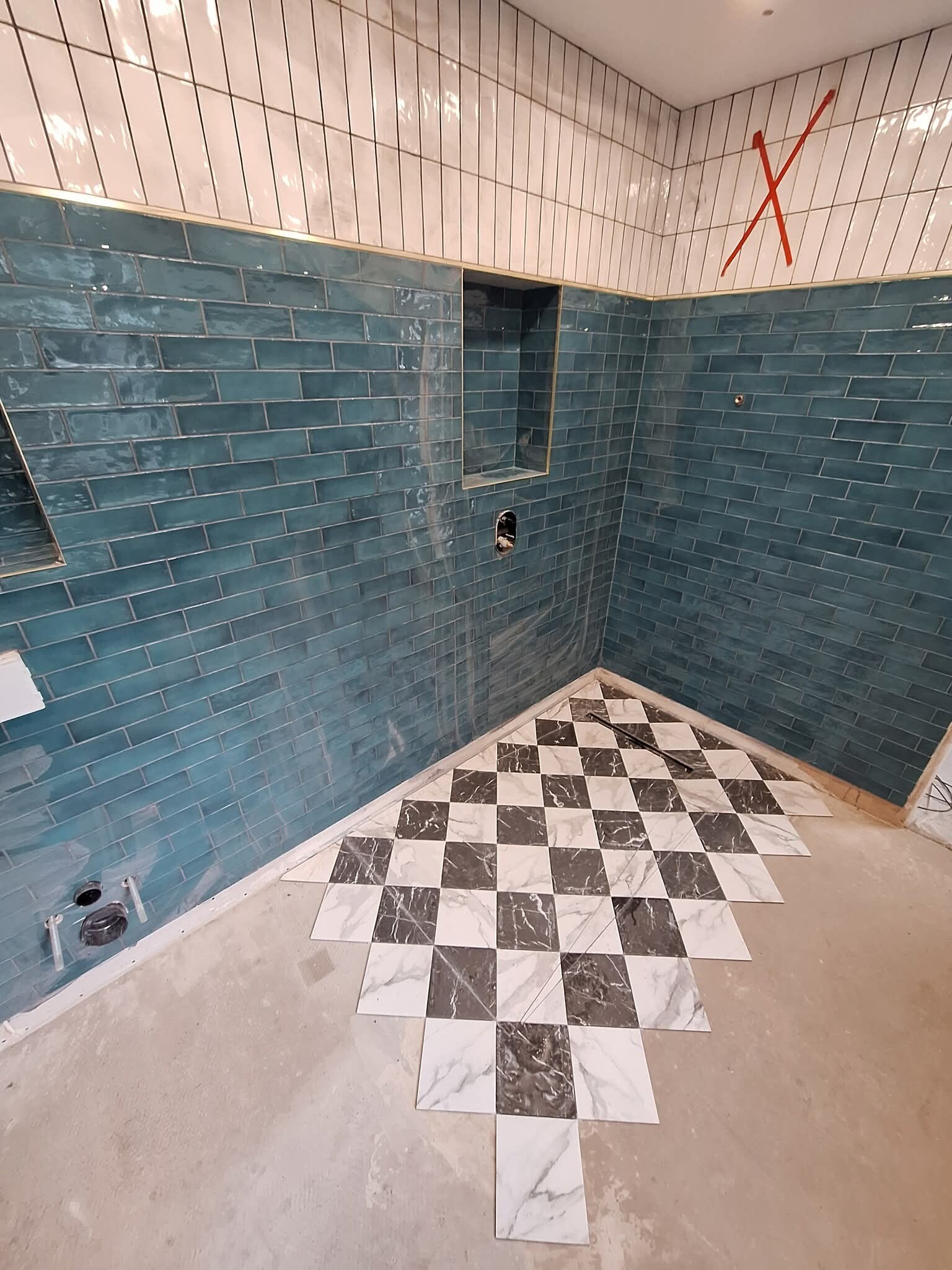 For this customer, we carried out a full main bathroom renovation. The room was stripped back to bare walls, and we built a new partition wall to house all pipework, niches, and the floating toilet system — which required careful planning and space management.