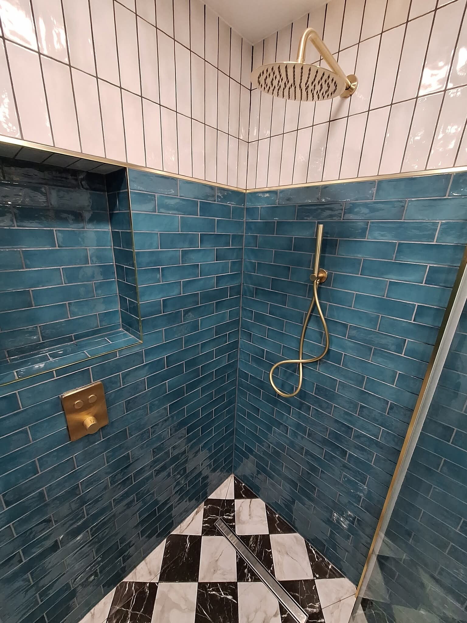 We created a spacious wet room shower area, installed new ceiling lights, and added a douche spray for extra convenience. The entire bathroom was finished with gold-coloured accessories, including taps, shower fittings, radiator, and more — giving the space a warm, luxurious feel.