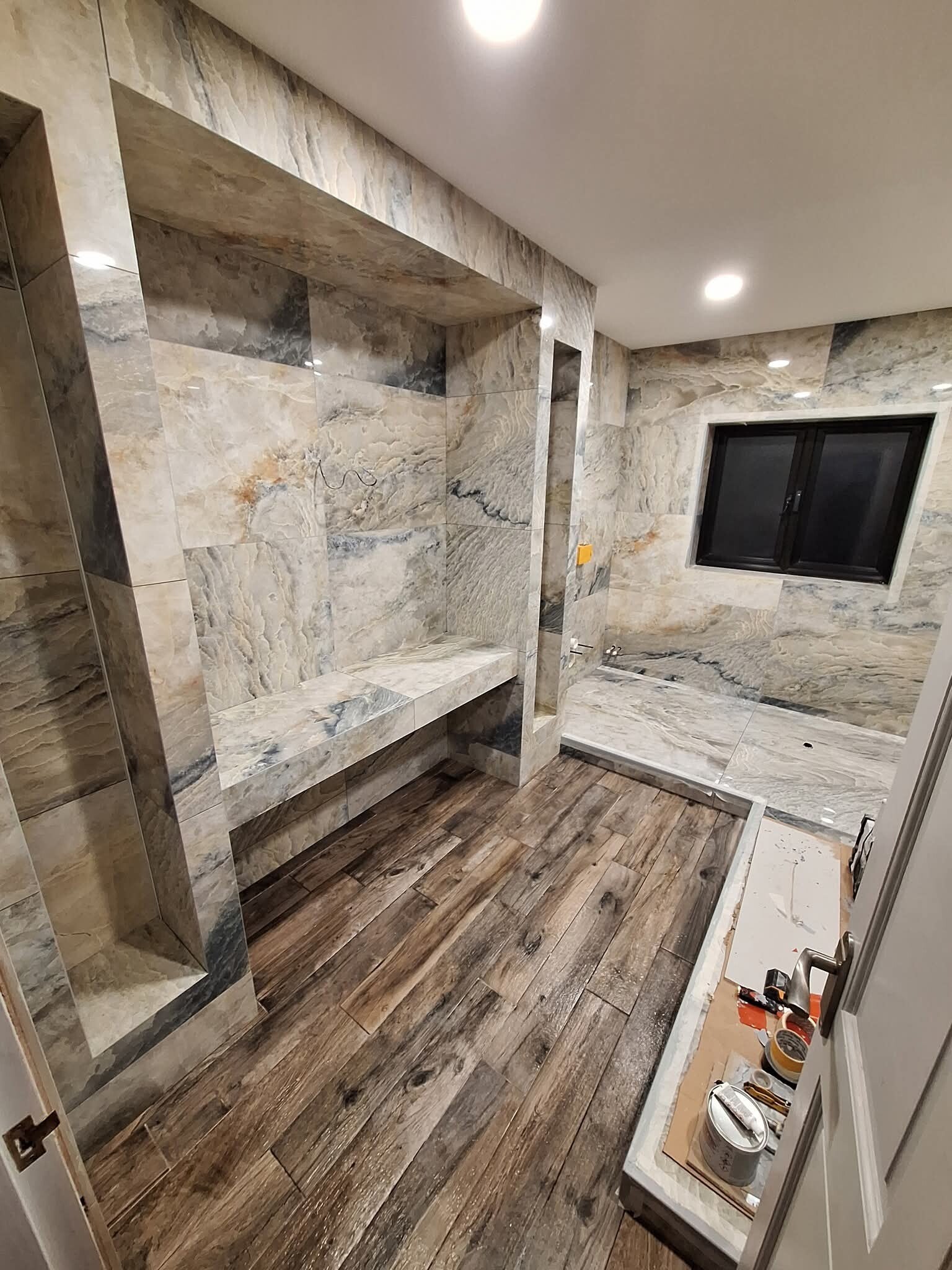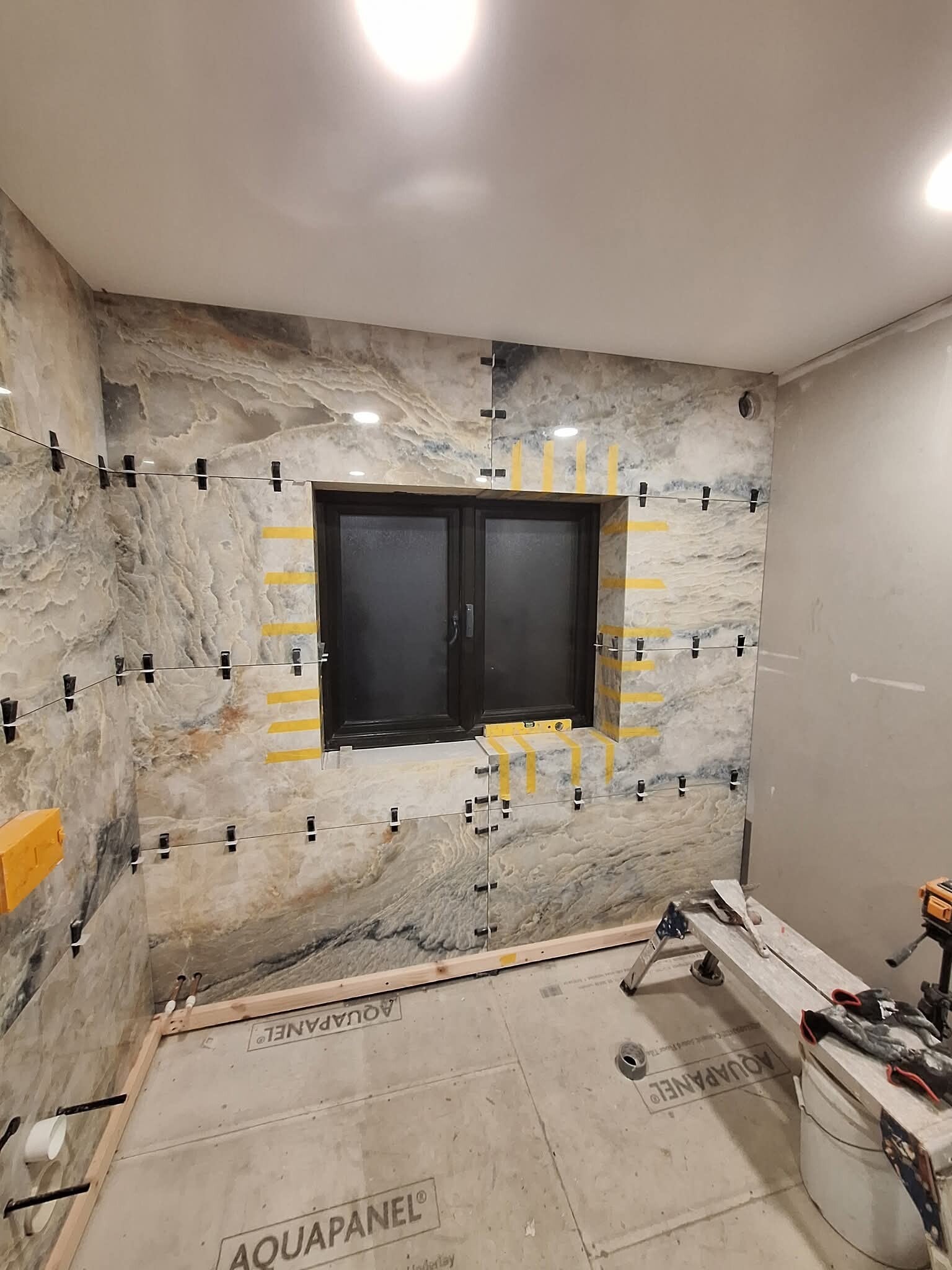 This was a fairly big project for us, with all materials supplied by Roccia in Preston. The standout feature was the tile chamfering — a time-consuming process, but well worth it. By avoiding tile trims, we achieved a seamless, high-end finish that looks fantastic.
