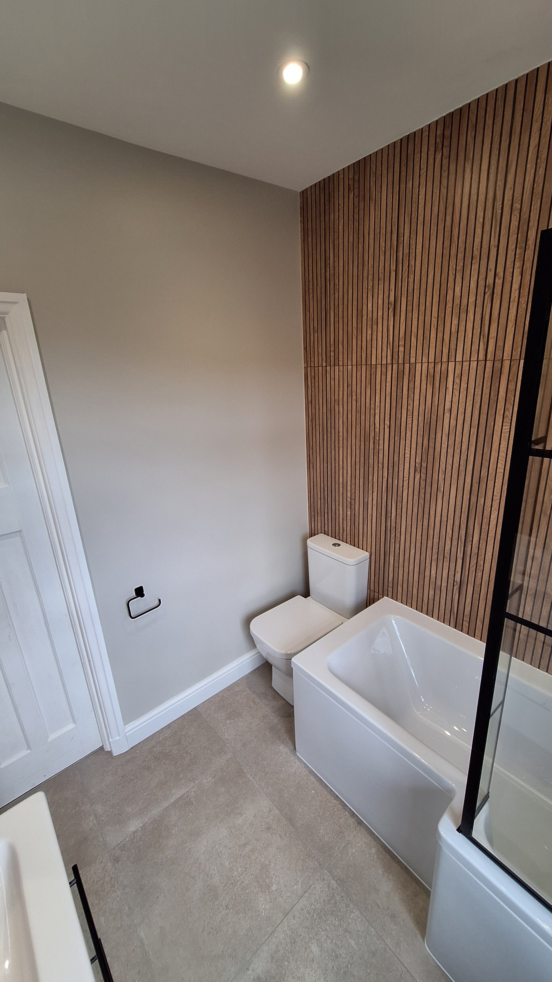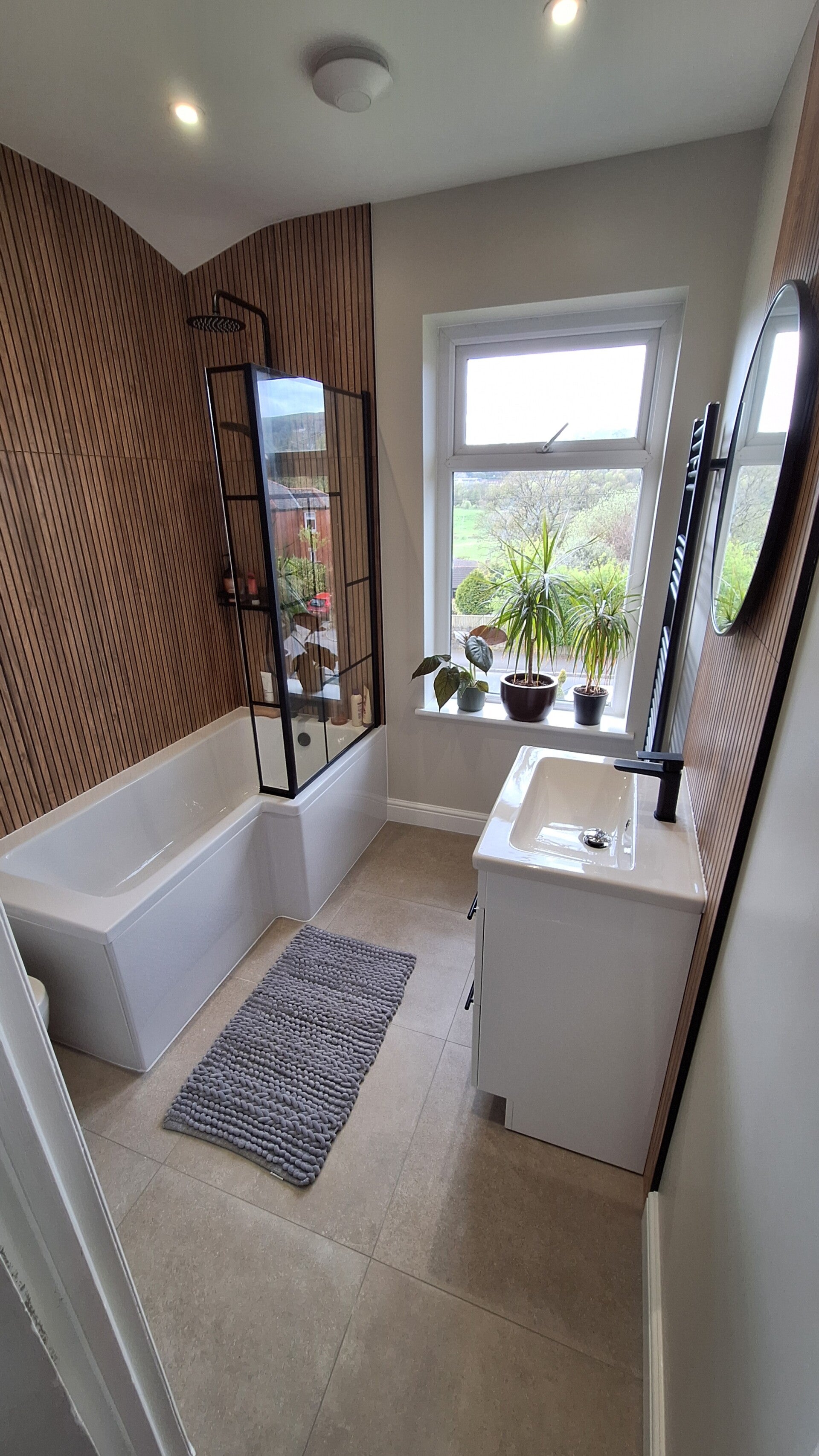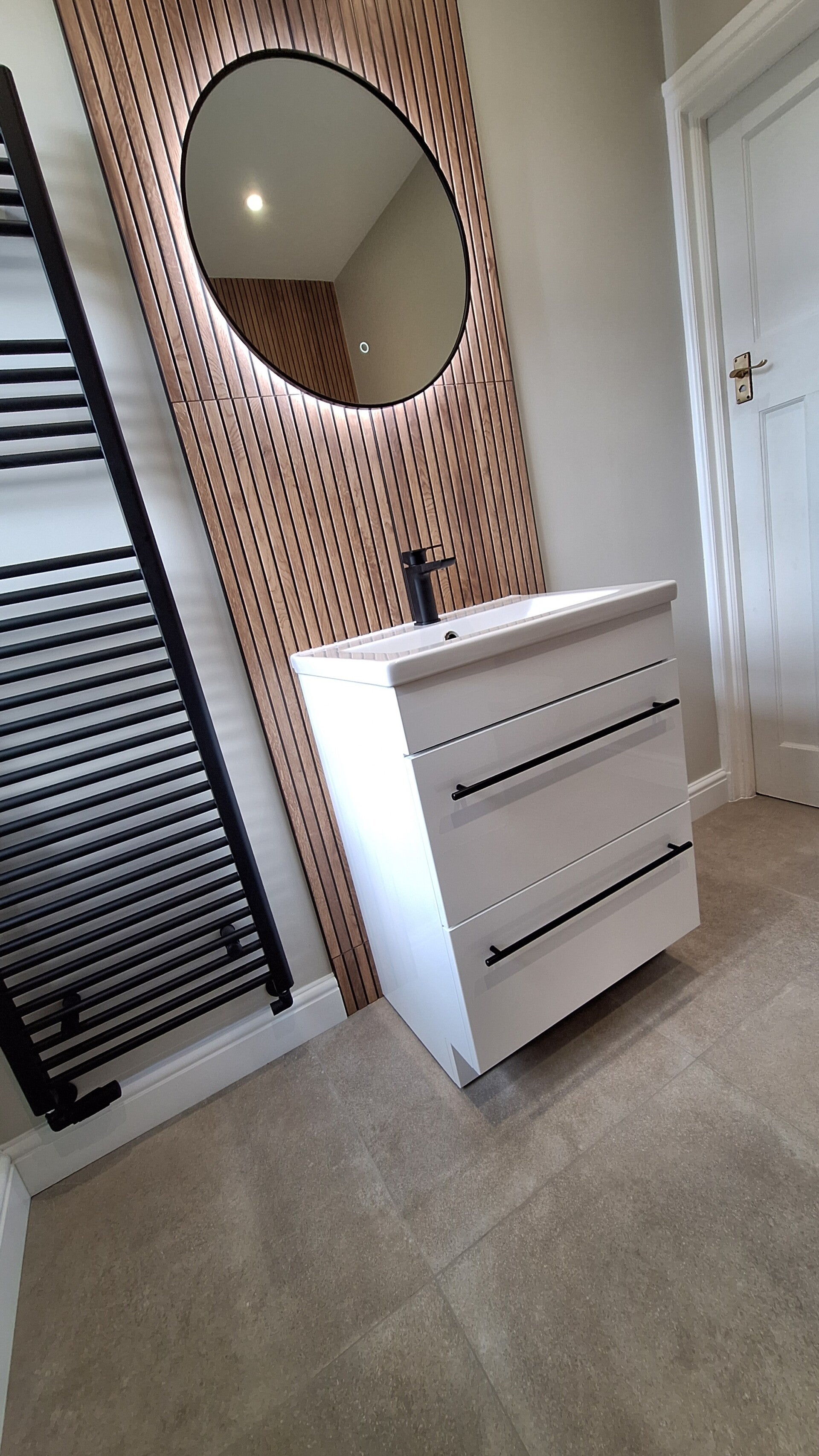 One of the standout features is the decorative wood‑panelled wall, where we mounted an LED mirror. When the lighting is on, it creates a warm, elegant glow that completely transforms the atmosphere. The customer added a bit of greenery afterwards, and it brought the whole space to life — the bathroom now feels fresh, modern and beautifully balanced.