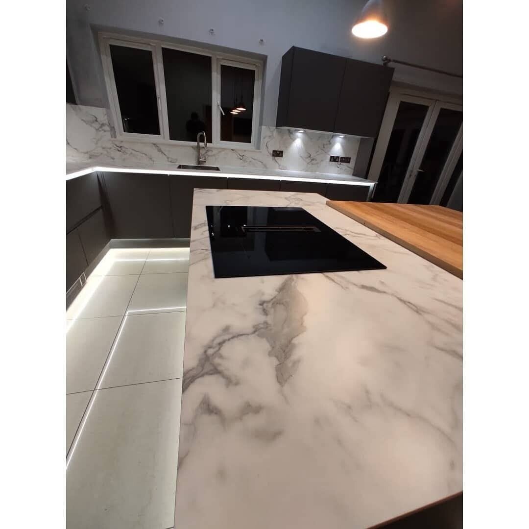 This kitchen features drop-down lights above the island, under-unit and base-unit lighting for added atmosphere, and beautiful splashbacks matched to the worktops for a clean, cohesive finish. A standout feature is the large, powerful extraction hood built into the island - both practical and visually striking. The result is a modern, high-quality kitchen tailored to the customer’s taste.