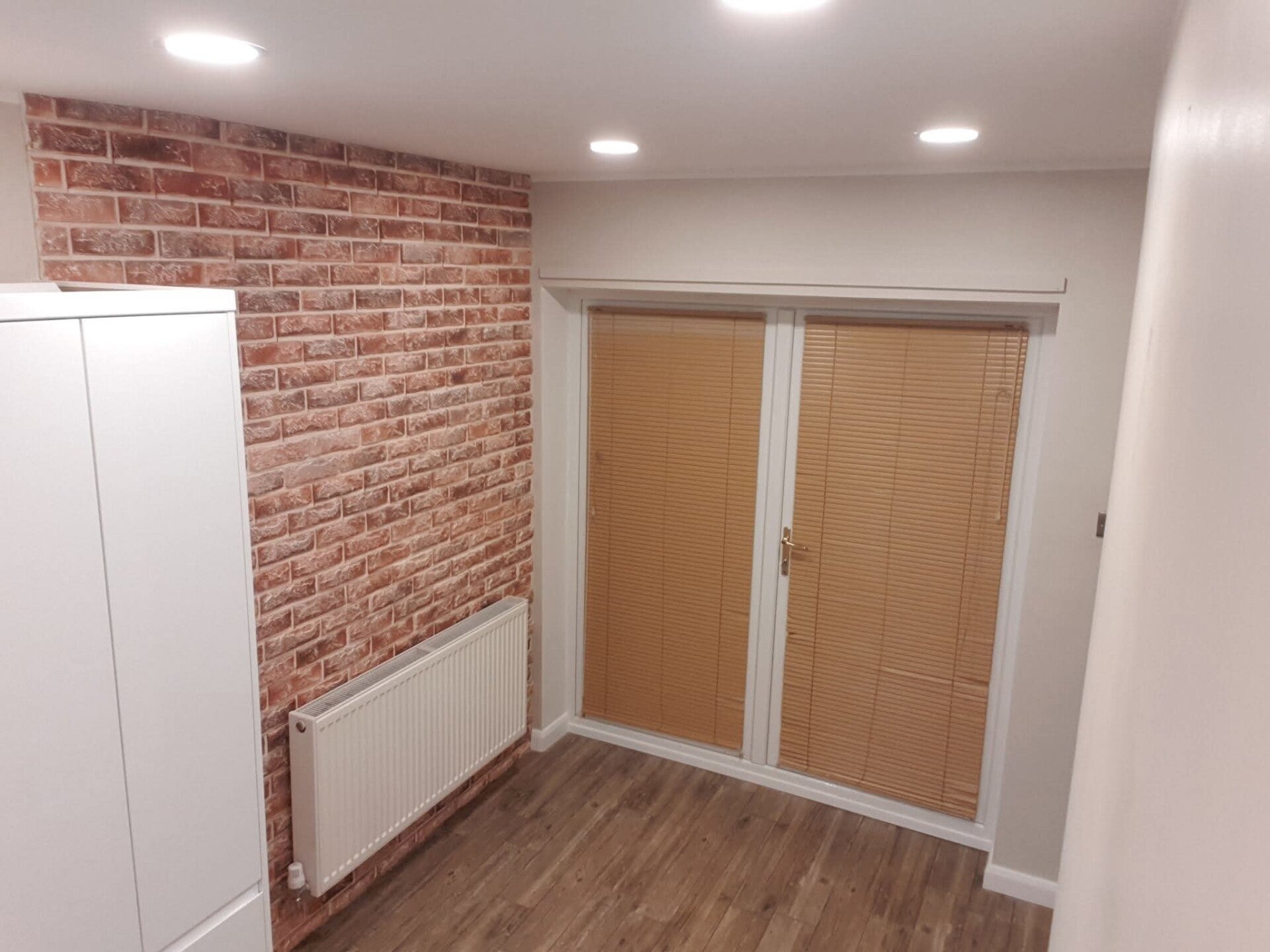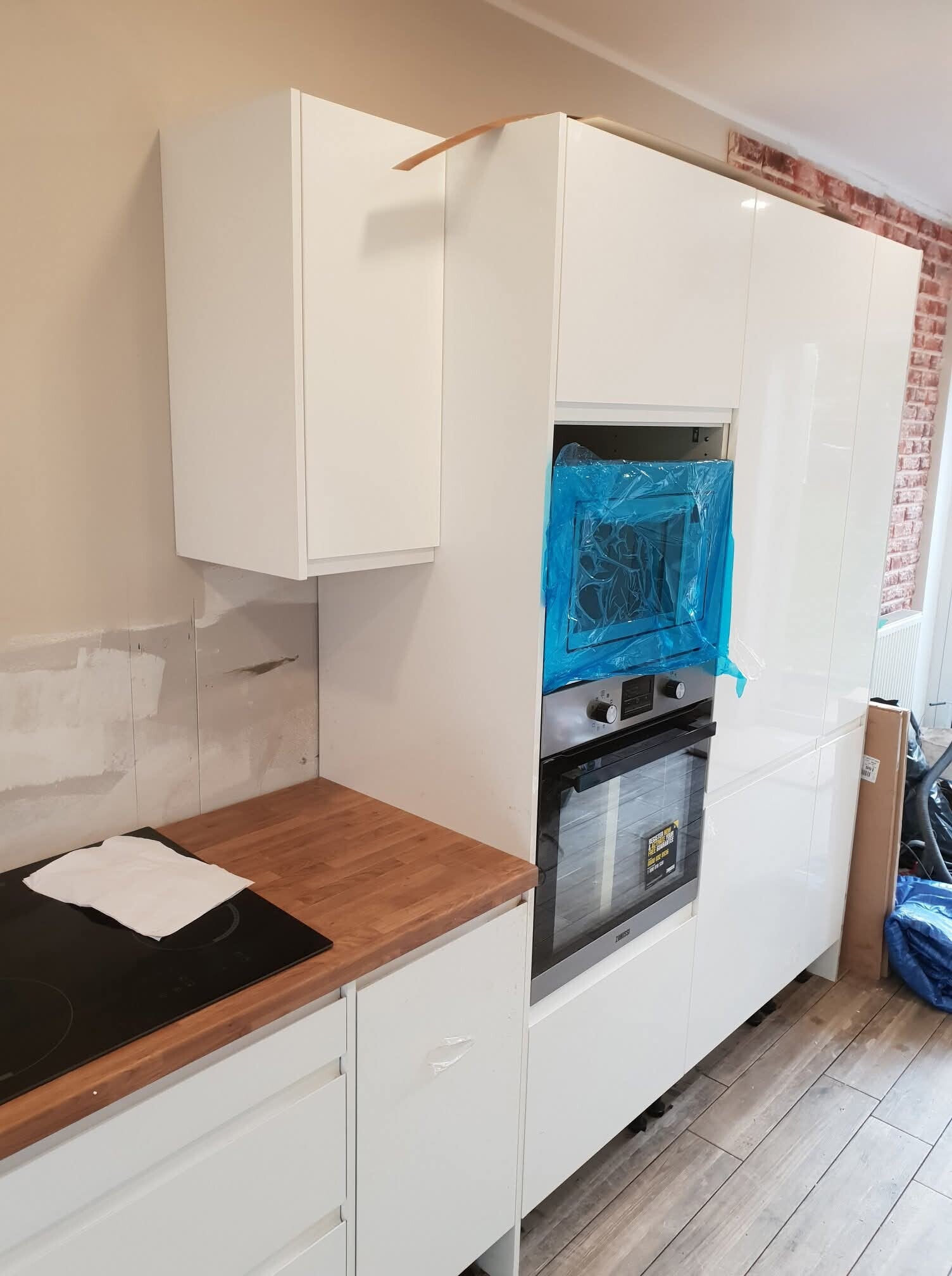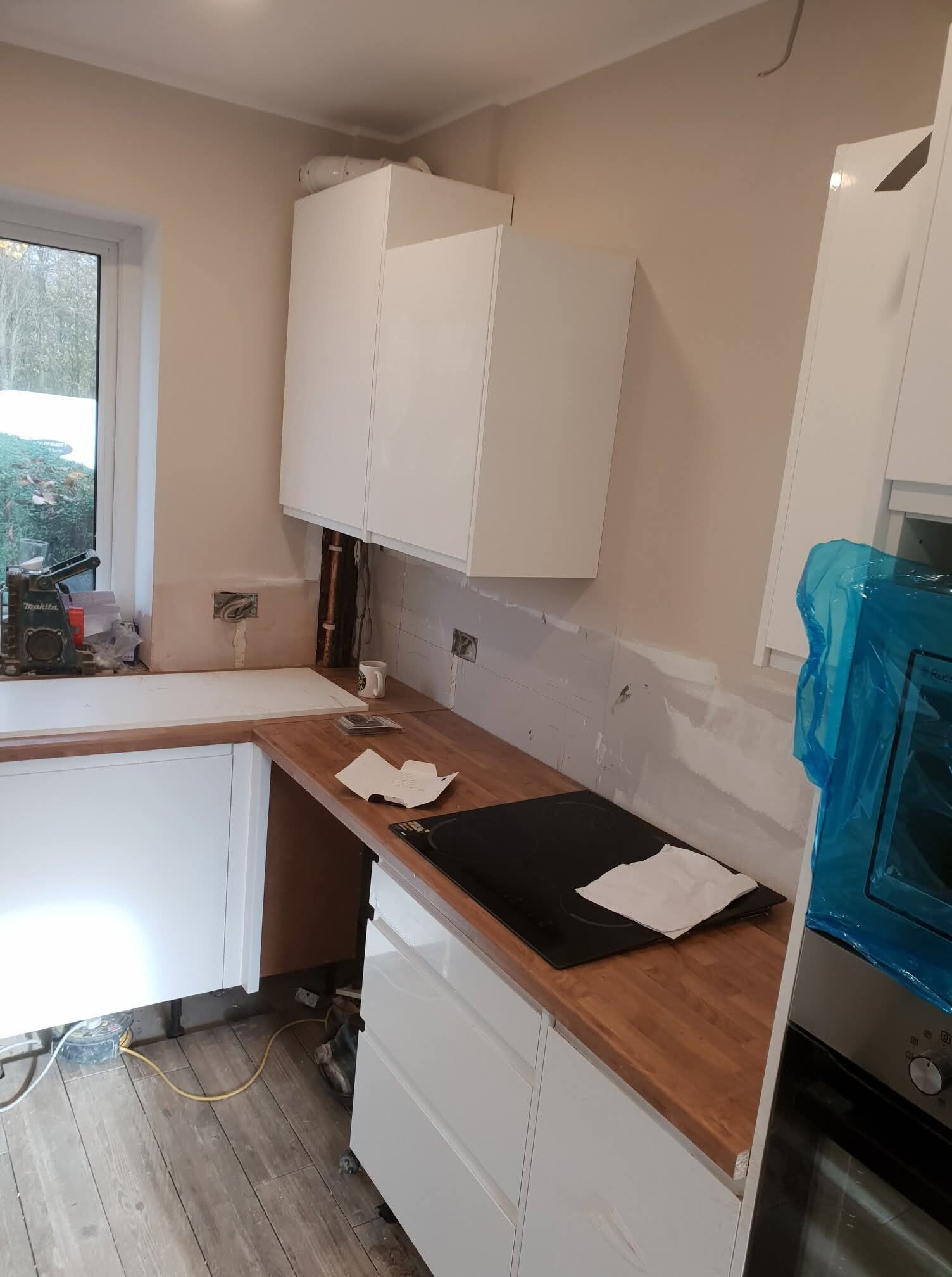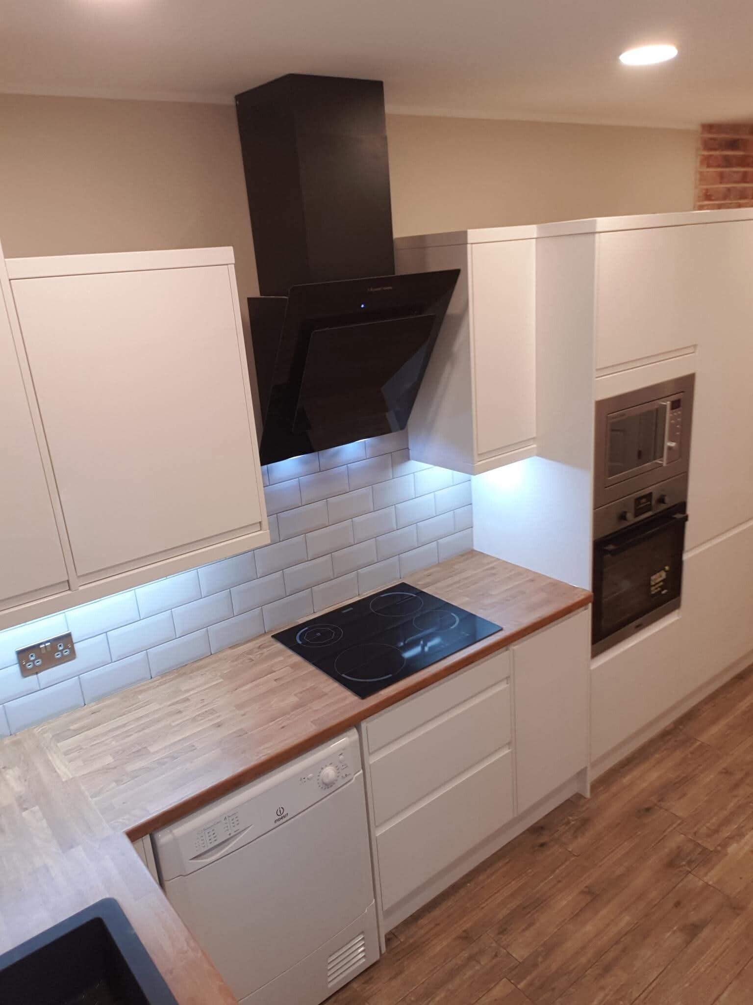 A new kitchen was supplied and fitted, including integrated appliances, upgraded storage, and a more efficient layout tailored to the customer’s needs. We carried out all plumbing and electrical alterations, ensuring the kitchen was fully updated to current standards. This included repositioning services, adding new sockets, and installing energy‑efficient lighting.
