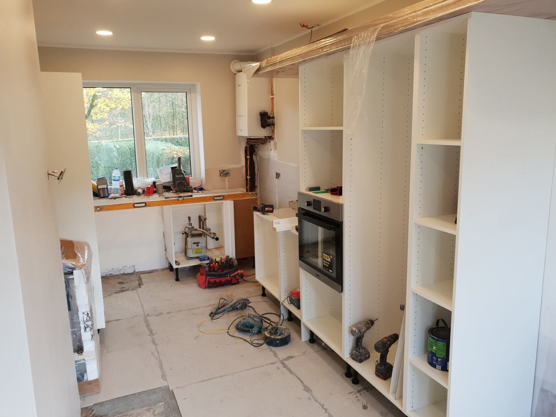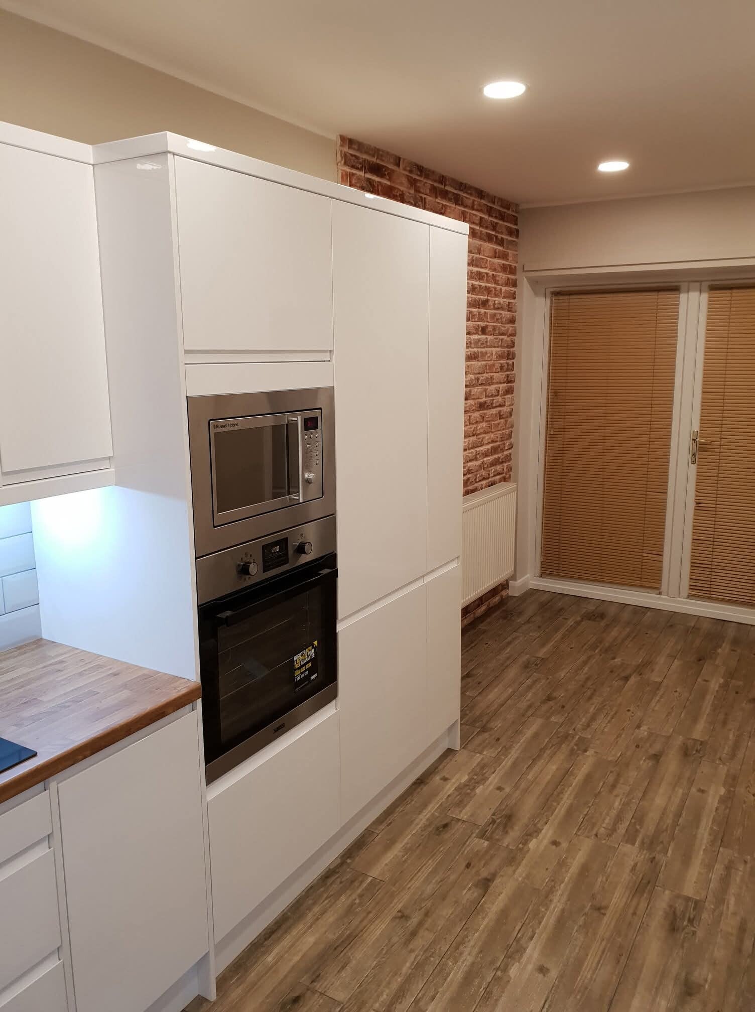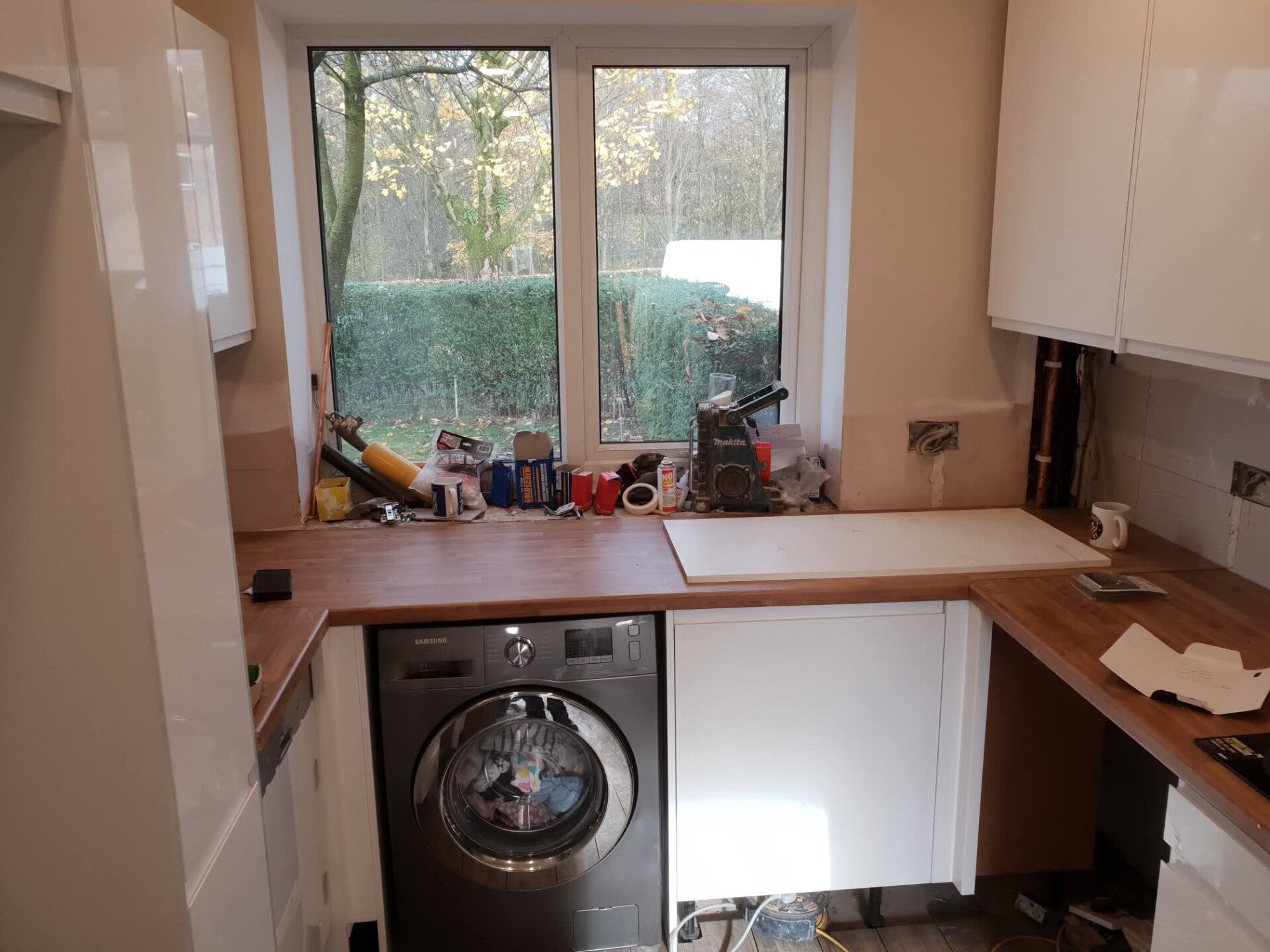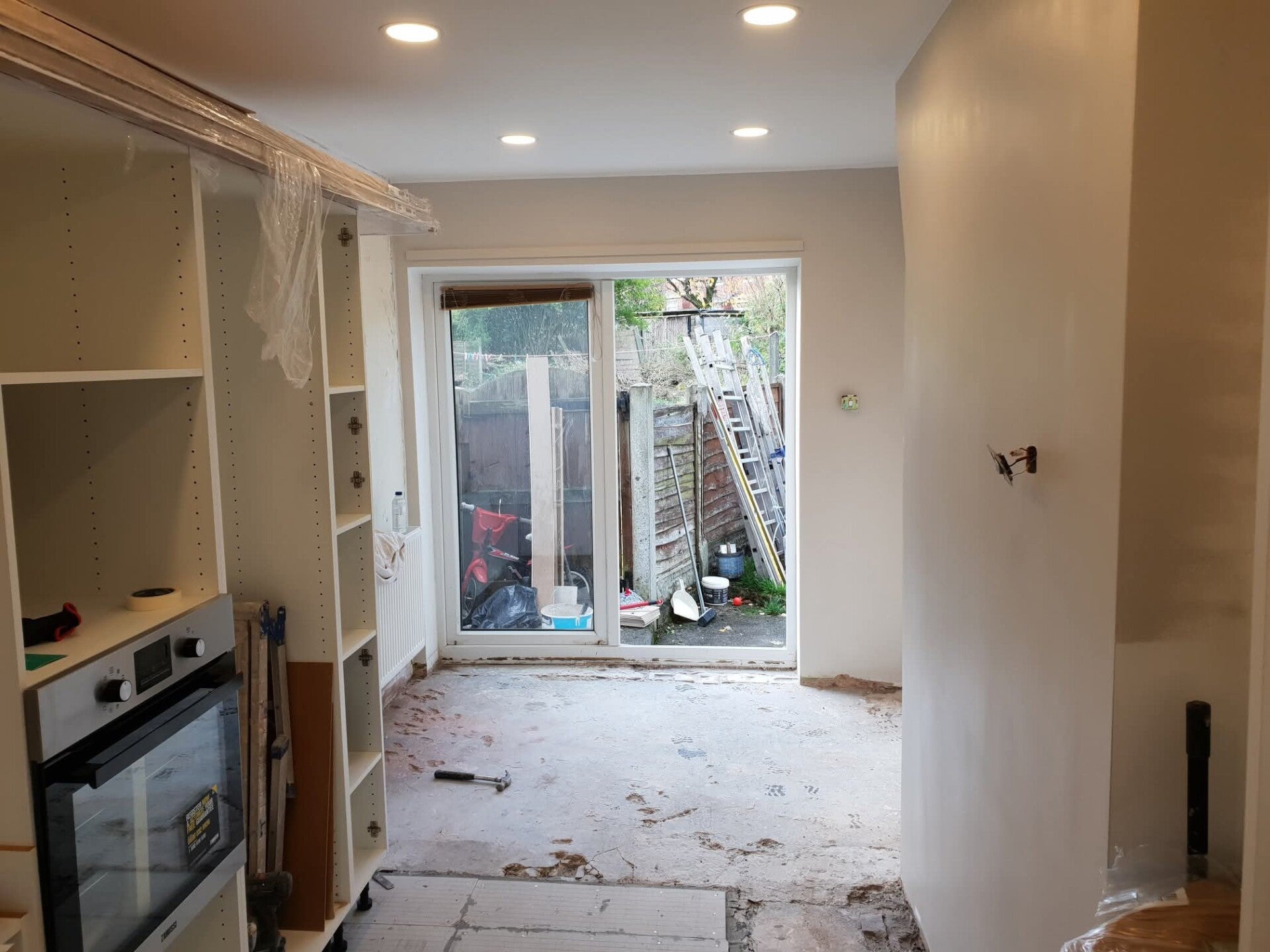 A new kitchen was supplied and fitted, including integrated appliances, upgraded storage, and a more efficient layout tailored to the customer’s needs. We carried out all plumbing and electrical alterations, ensuring the kitchen was fully updated to current standards. This included repositioning services, adding new sockets, and installing energy‑efficient lighting.