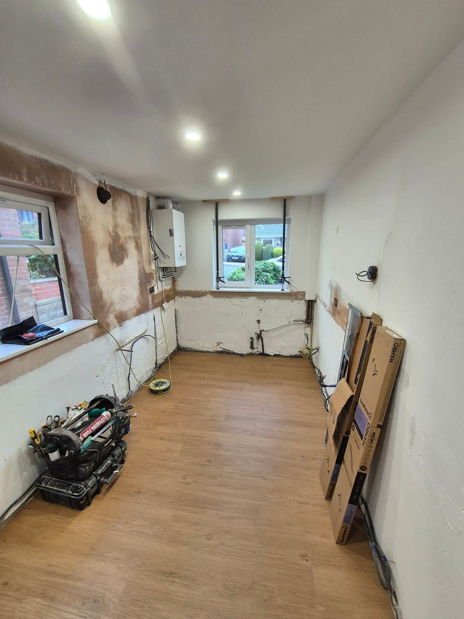This full kitchen renovation in Whalley completely transformed the space from top to bottom. The project began with a full strip‑out, followed by preparing the room with new flooring, fresh wall finishes and a fully updated ceiling. We installed new electrics throughout the kitchen, including modern lighting, and added a high‑quality under‑sink water filter system for everyday convenience.