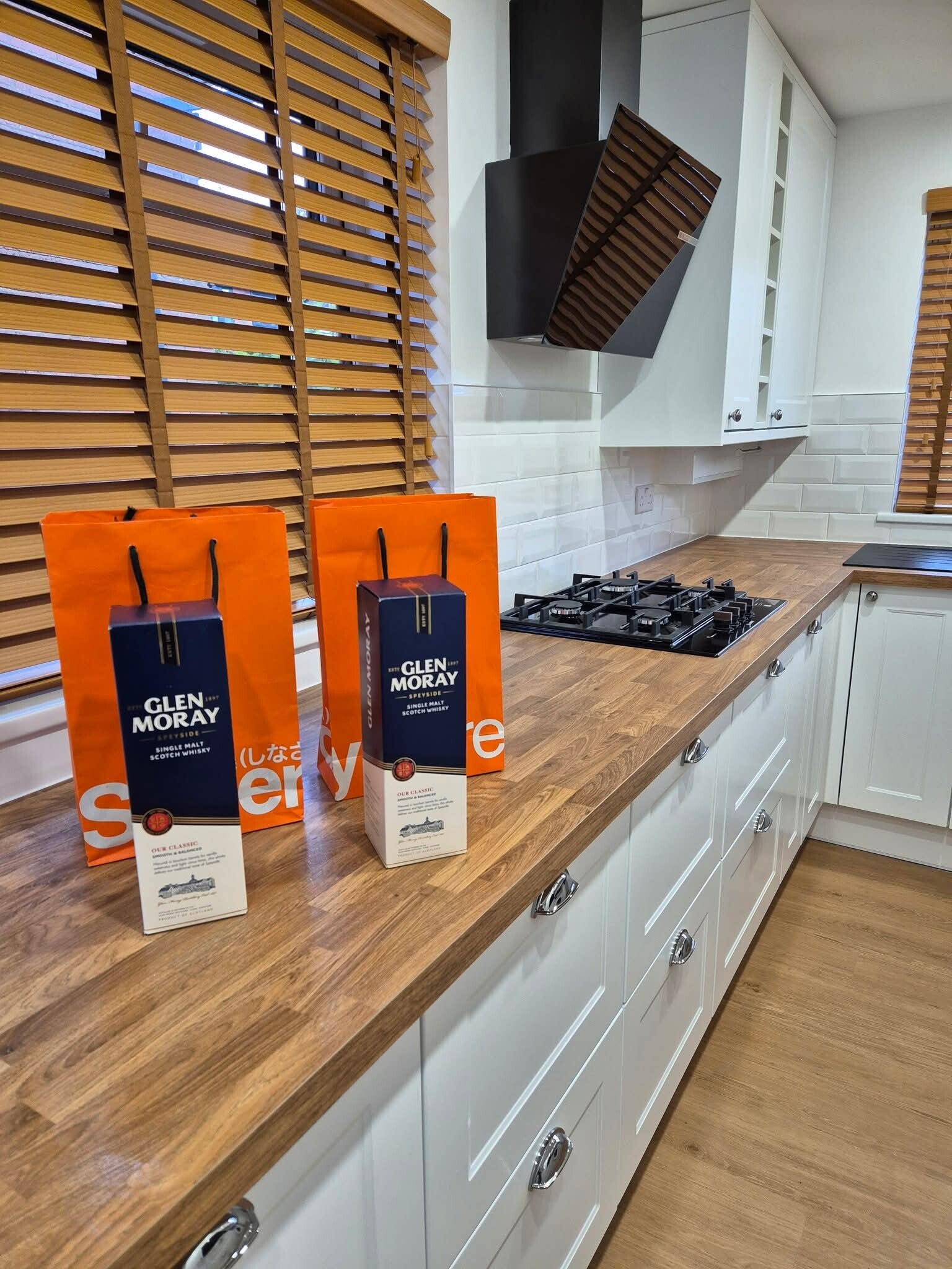 The customer chose a clean white kitchen with a modern, minimalist look. Instead of standard base units, they opted for full‑extension drawer systems, giving them better storage, easier access and a more premium feel. To complement the white cabinetry, we fitted wood‑effect worktops and matching flooring, creating a warm contrast and a natural flow through the room.