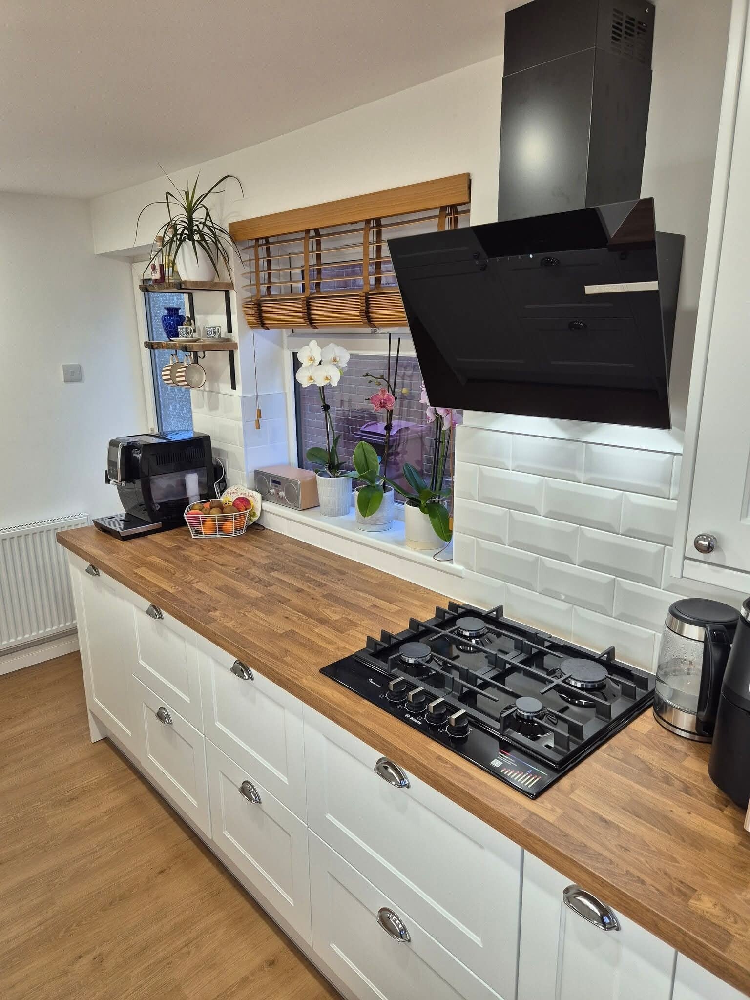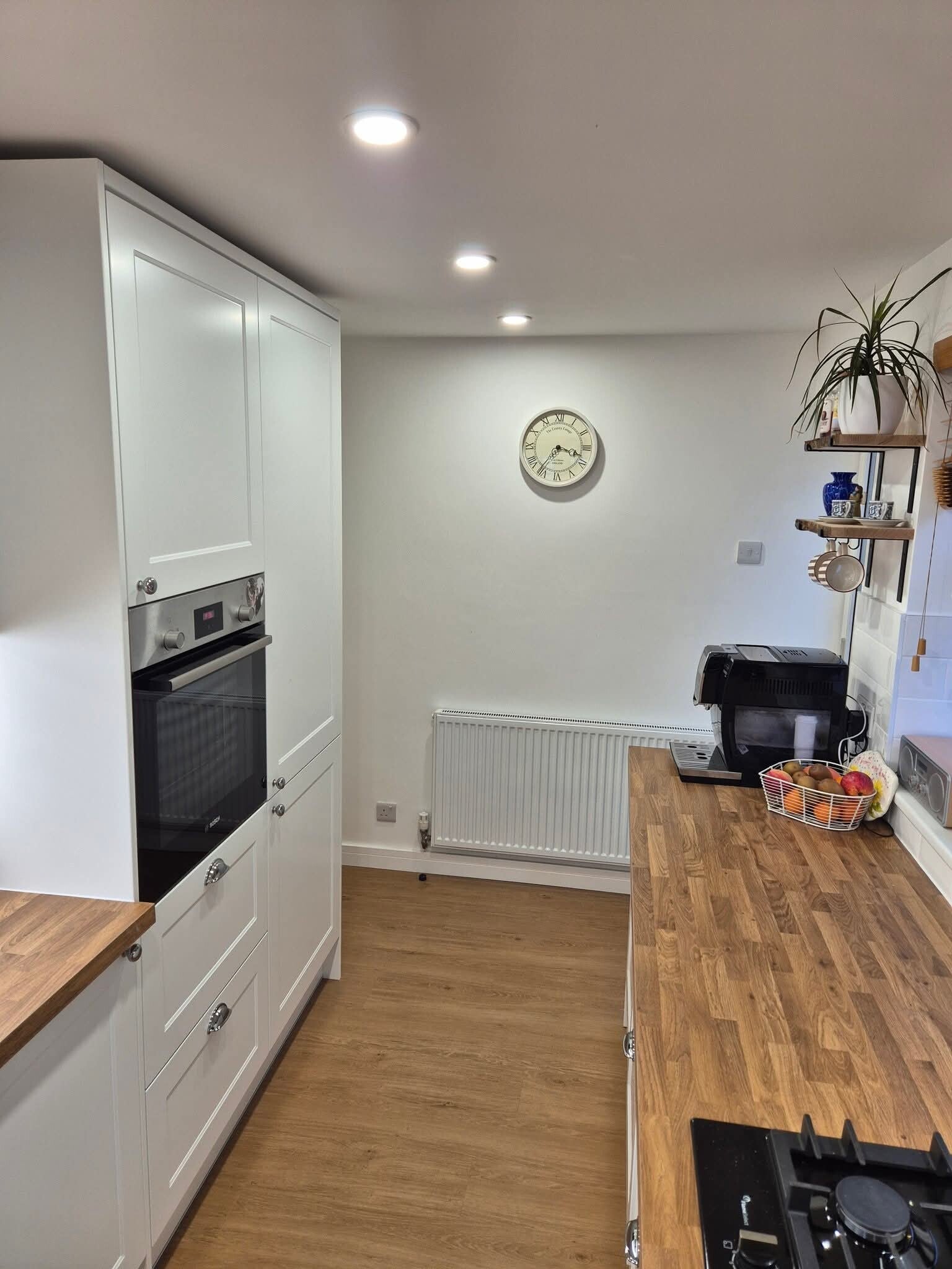 The finishing touches included small white brick‑style wall tiles above the worktops, giving the kitchen a classic, timeless look. As with all our projects in Whalley, we handled every stage of the renovation — from electrics and plumbing to installation and final detailing — delivering a fully completed, ready‑to‑use kitchen.