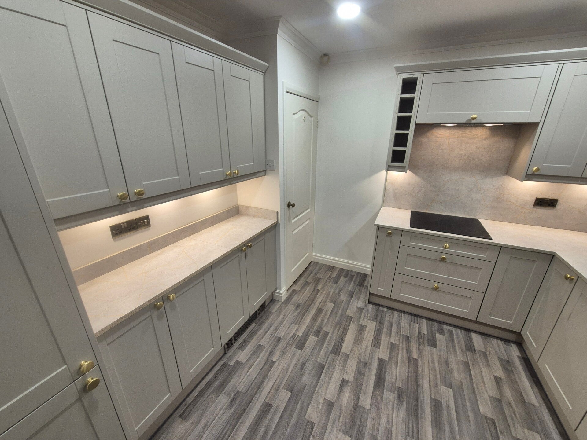 We added new LED lighting on the ceiling and under the wall units, plus a plinth heater connected to the existing heating pipes to keep the kitchen warm. The worktops were finished with matching wallboards and brushed gold details — trims, taps and socket fronts — bringing the whole design together.